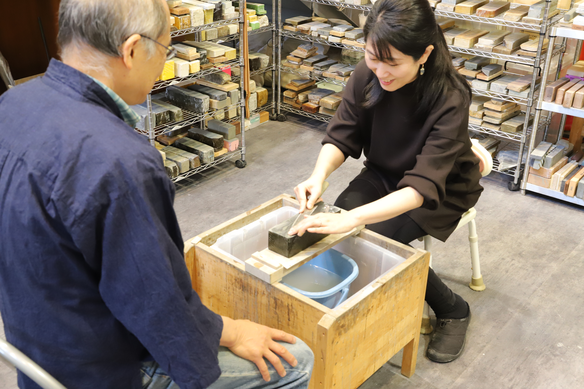 研ぎ体験では、包丁研ぎ講習をはじめ、オリジナル砥石制作、砥石の研ぎ比べができます。また、不定期でペーパーナイフ制作などワークショップを行っております。